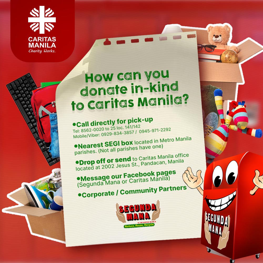 by calling our numbers (0945-971-2292 / 0929-834-3857/8562-0020 TO 25 LOC. 141/142) or messaging Segunda Mana or Caritas Manila on Facebook.